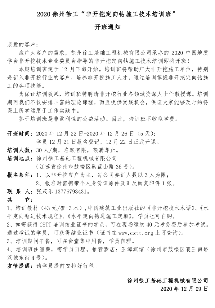 本期培訓(xùn)班定于2020年12月22-26日在徐州舉辦(學(xué)員12月21日報名登記)。考慮到疫情秋冬季的不確定性,2020年非開挖水平定向鉆方向的培訓(xùn)班在徐州計劃就召開這一次。請有需要的單位,詳細(xì)閱讀本通知,并于2020年12月18日前完成報名。